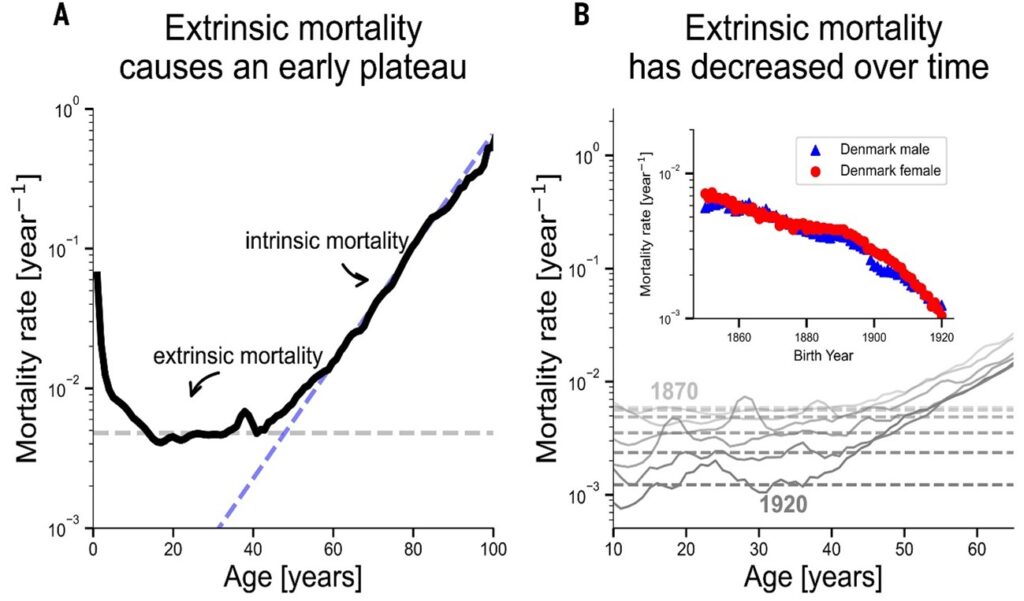 その結果、下図Aのように、たとえば1880年生まれのデンマーク人女性の場合、乳幼児期に死亡率が高いほか、40歳くらいまで、一定の割合で死亡が見られている。それを超えた場合には、年齢とともに死亡率が等比級数的に増加するという結果になった。その解釈として、前者の期間では外因性死亡が死亡の主体となり、後者の期間では内因性死亡が主体となっていることが背景にあると考えられた。
